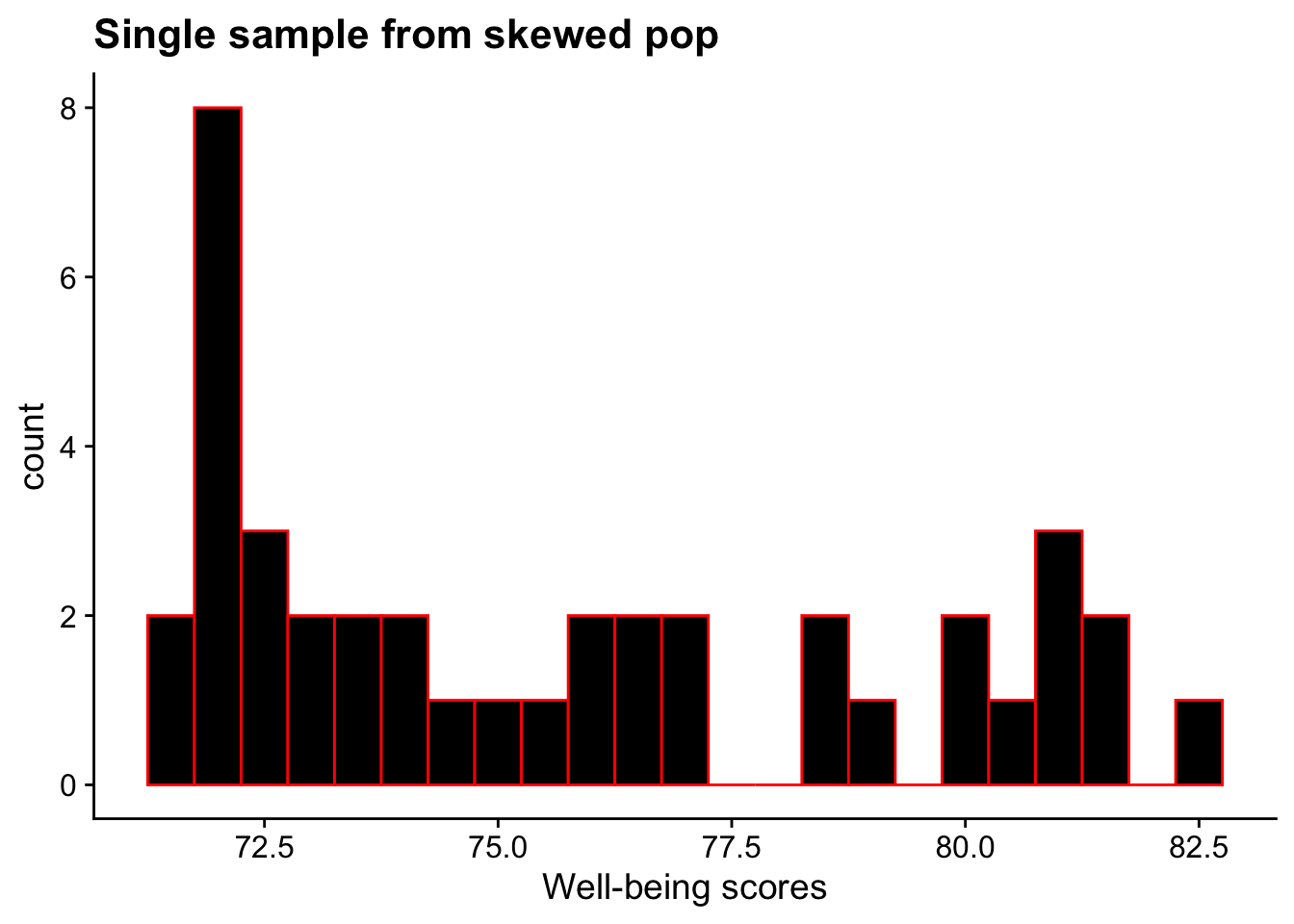 labs(title = "Single sample from skewed pop", x = "Well-being scores") + theme_cowplot()