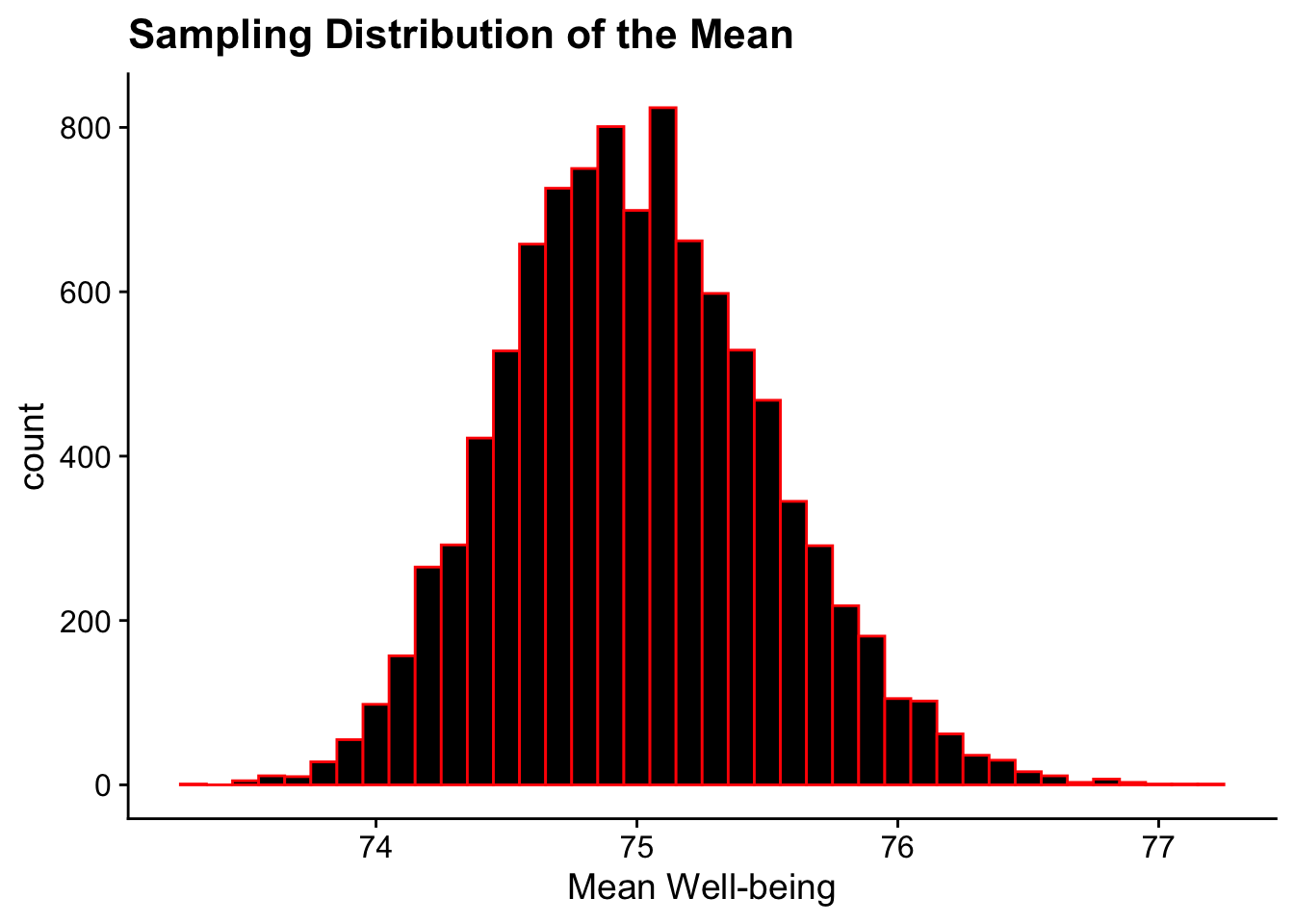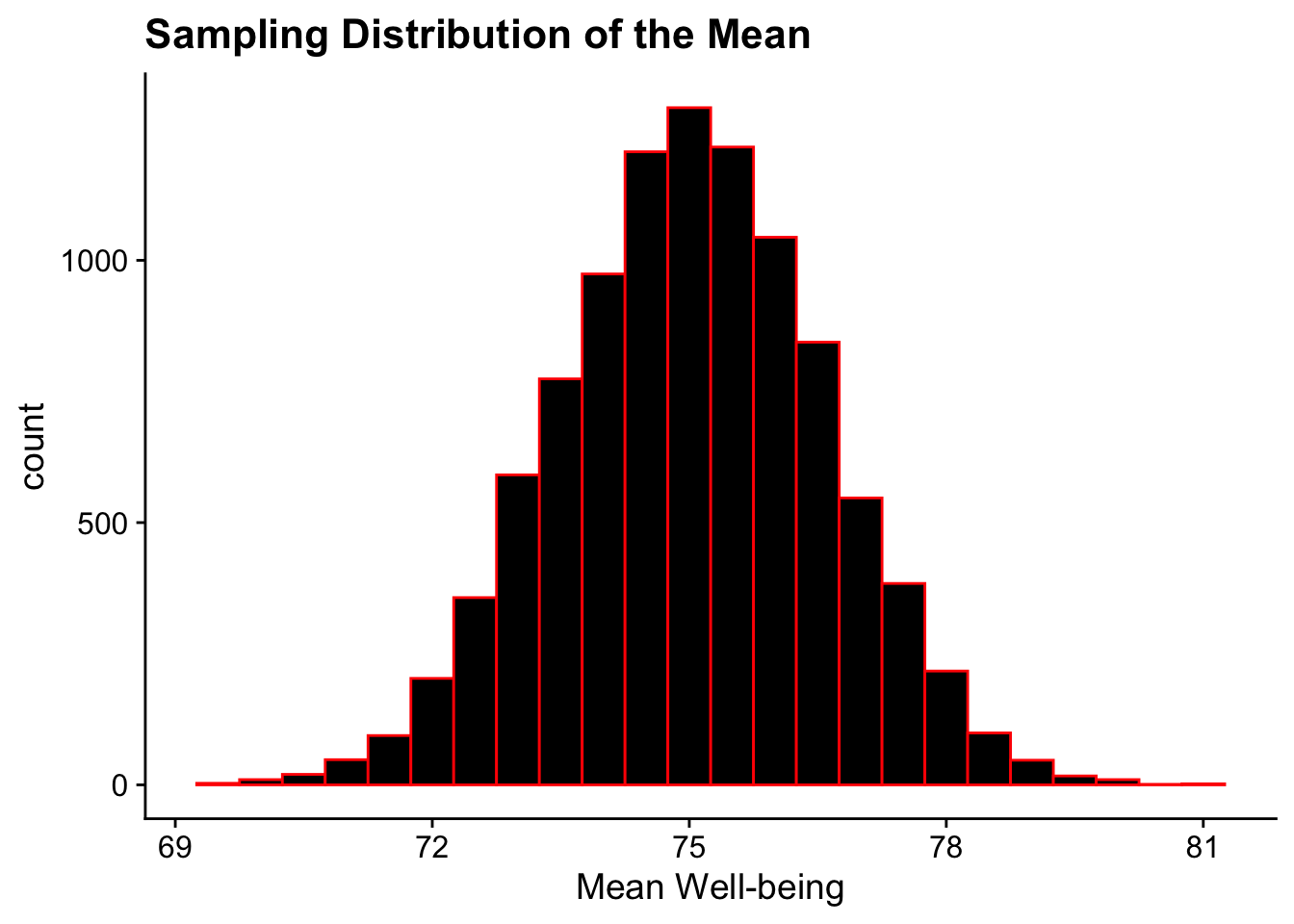labs(title = "Sampling Distribution of the Mean", x = "Mean Well-being") + theme_cowplot()