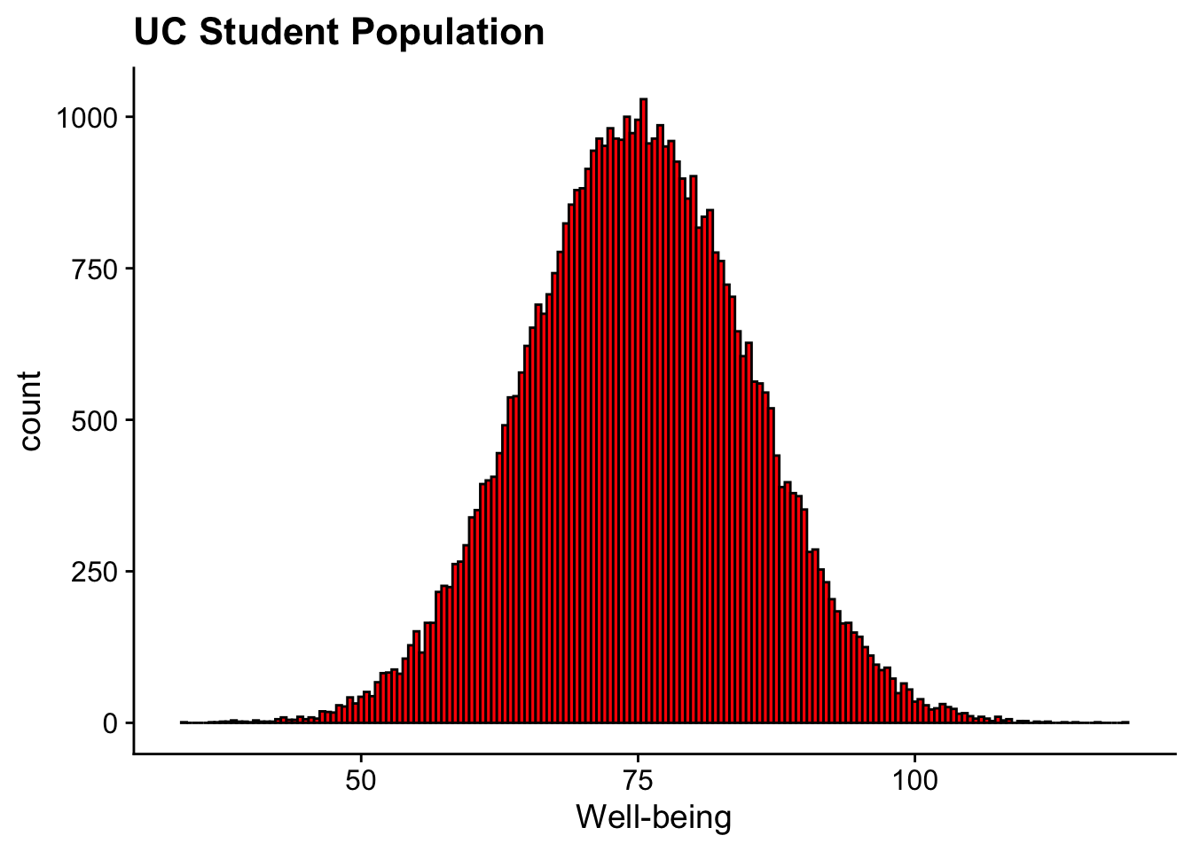 Let’s create a hypothetical sampling distribution of means. In this case we’ll start with our 50,000 strong population of students here at UC (Go Bearcats!). Let’s imagine that we are obtaining Well-Being scores for each student, we this is a composite score that quantifies students’ perceived quality of life, life satisfaction, and psychological health. The score is derived from a validated questionnaire administered to students at the beginning of the semester.