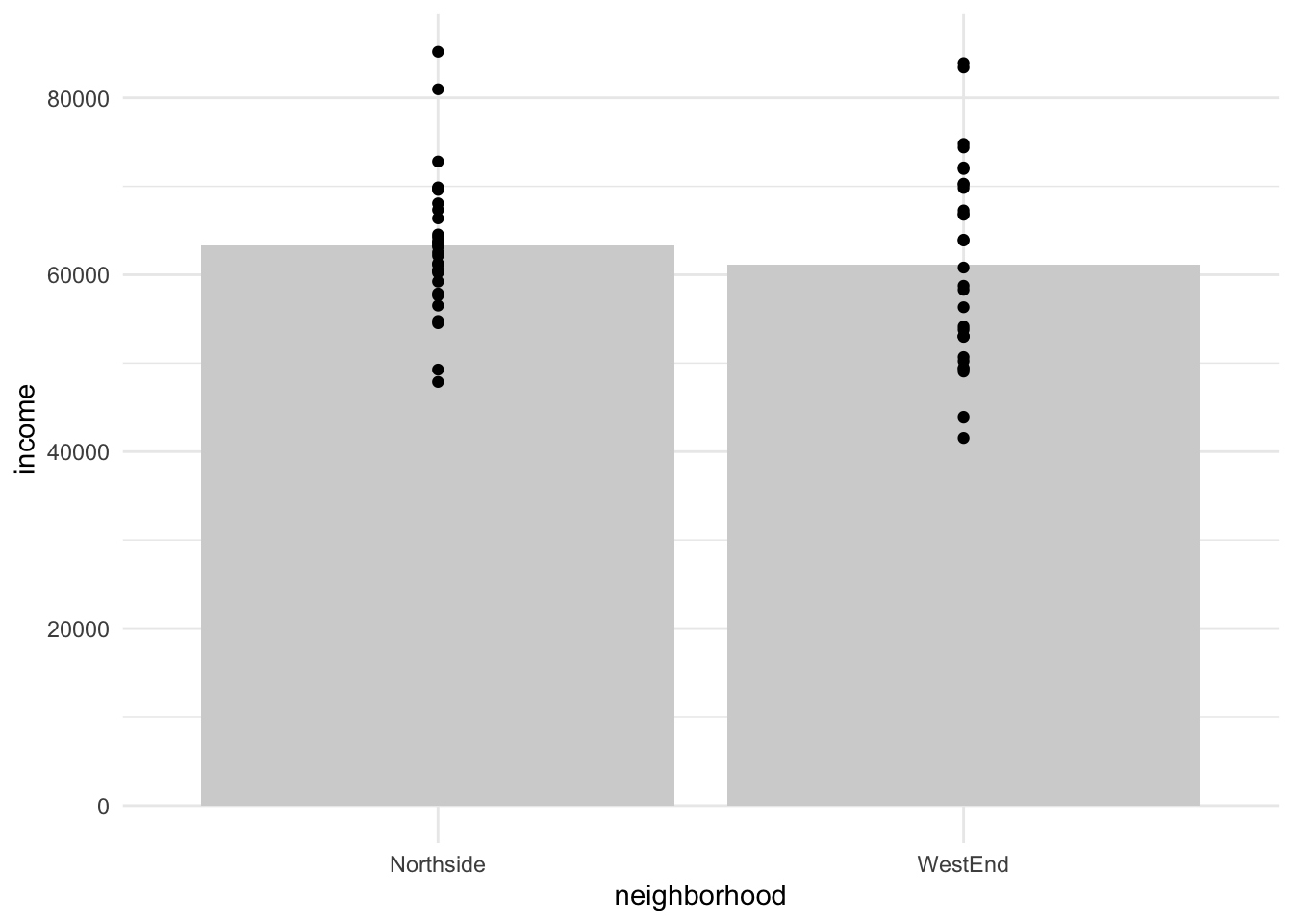 As you can see in the plot above, even though the mean incomes for the neighborhoods are the same, the variances of the two neighborhoods are quite different. This reflects a wider dispersion of incomes in West End, where the mean is a consquence of a few high income households balancing against lower income households (gentrification, perhaps?). In Northside, the gap between households in our sample is not so great.