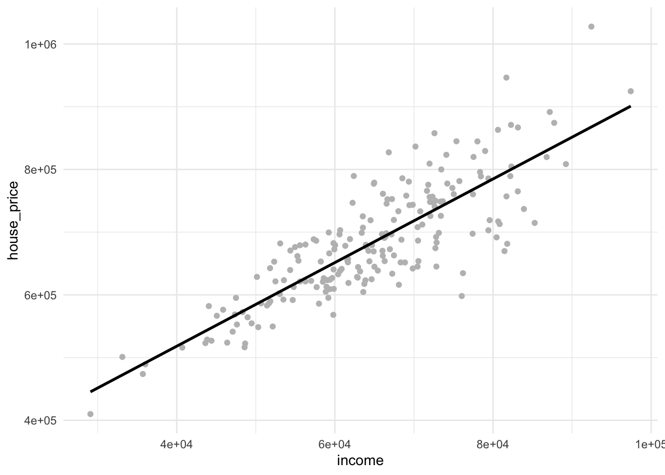 set.seed(42)# Create a sample of 200 householdsn <-200income <-rnorm(n, mean =65000, sd =12000)# Generate house prices based on income, but introduce more variability for higher incomes and less for lower incomesbaseline_price <-230000+7* income# Adjust variability for higher and lower incomes# Here, we're using a fraction of the income as the standard deviation for the variabilityvariable_component <-rnorm(n, mean =0, sd = income * .8)house_price <- baseline_price + variable_component# Clamp house prices between 230K and 800Khousehold_data <-tibble(income, house_price)# Plotggplot(household_data, aes(x=income, y=house_price)) +geom_point(color="gray") +geom_smooth(method=lm, level =0.95, color="black", se =FALSE) +theme_minimal()
