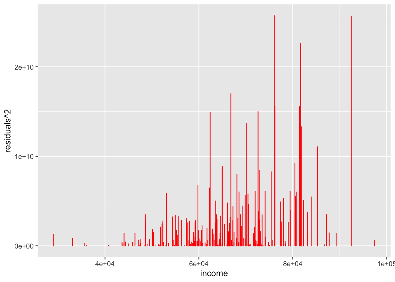 model <-lm(house_price~income, household_data)model_residuals <-residuals(model)household_data <- household_data %>%mutate(residuals = model_residuals)ggplot(household_data, aes(x = income, y = residuals^2)) +geom_col(color ="red")