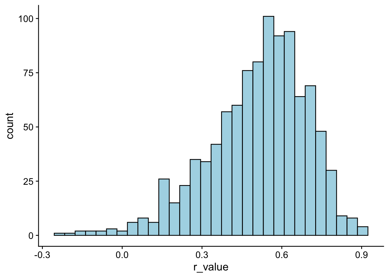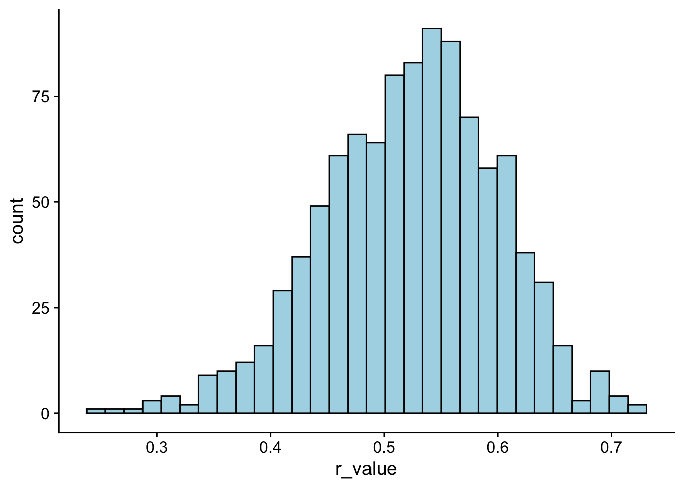 Note that when our sample size is small (N<30) we may need to adjust \(r\). This is because the sampling distribution of \(r\) is not normally distributed, most especially when you have strong correlations. Don’t believe me? Let’s bootstap 1000 simulations, this time assuming a sample size of only 20 people.