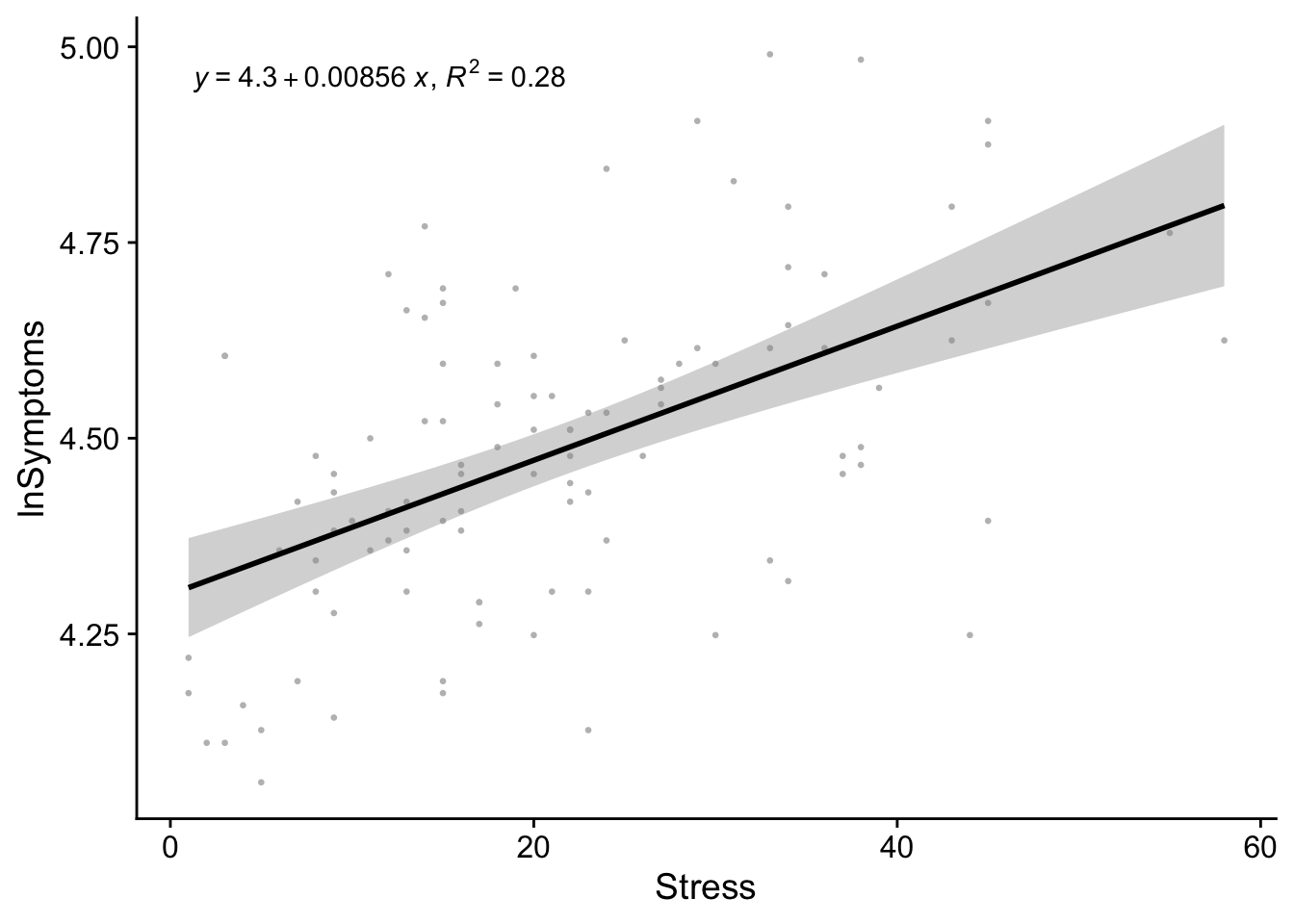 <- lm(lnSymptoms~Stress, data = stress_data) stress_symptoms_model