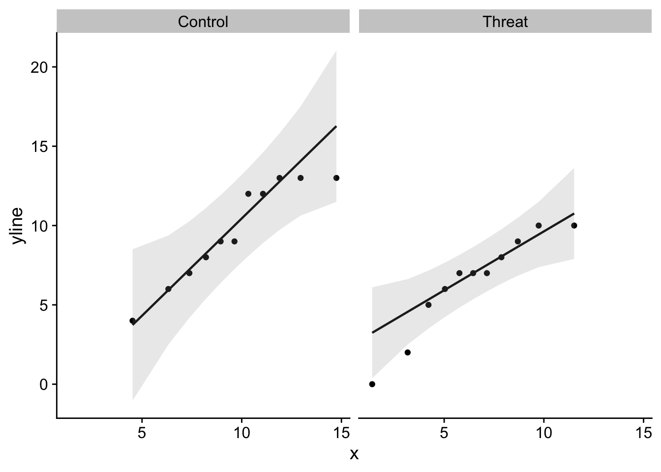 This output gives us the \(t\)-value (2.36), \(df\) (20) and \(p\)-value (.028). Based on this output I may conclude that the mean score in the Control group (9.636) is significantly greater than the Threat group (6.455).