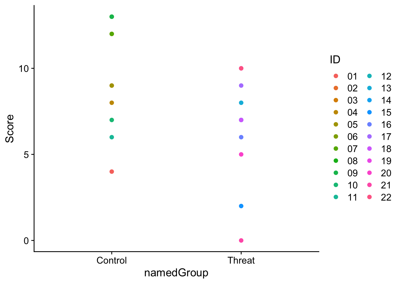 Let’s assume the set of scores from our previous example of sterotype threat. Here’s a plot of each of the data points obtained from the two groups of 11 participants each: