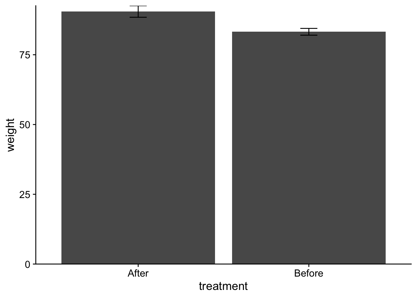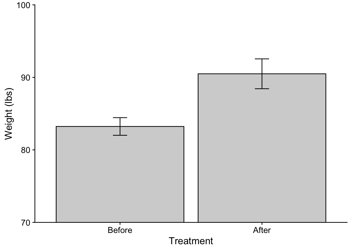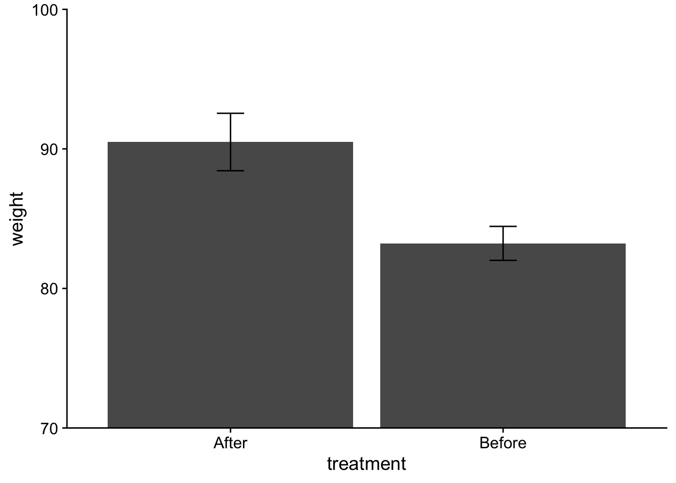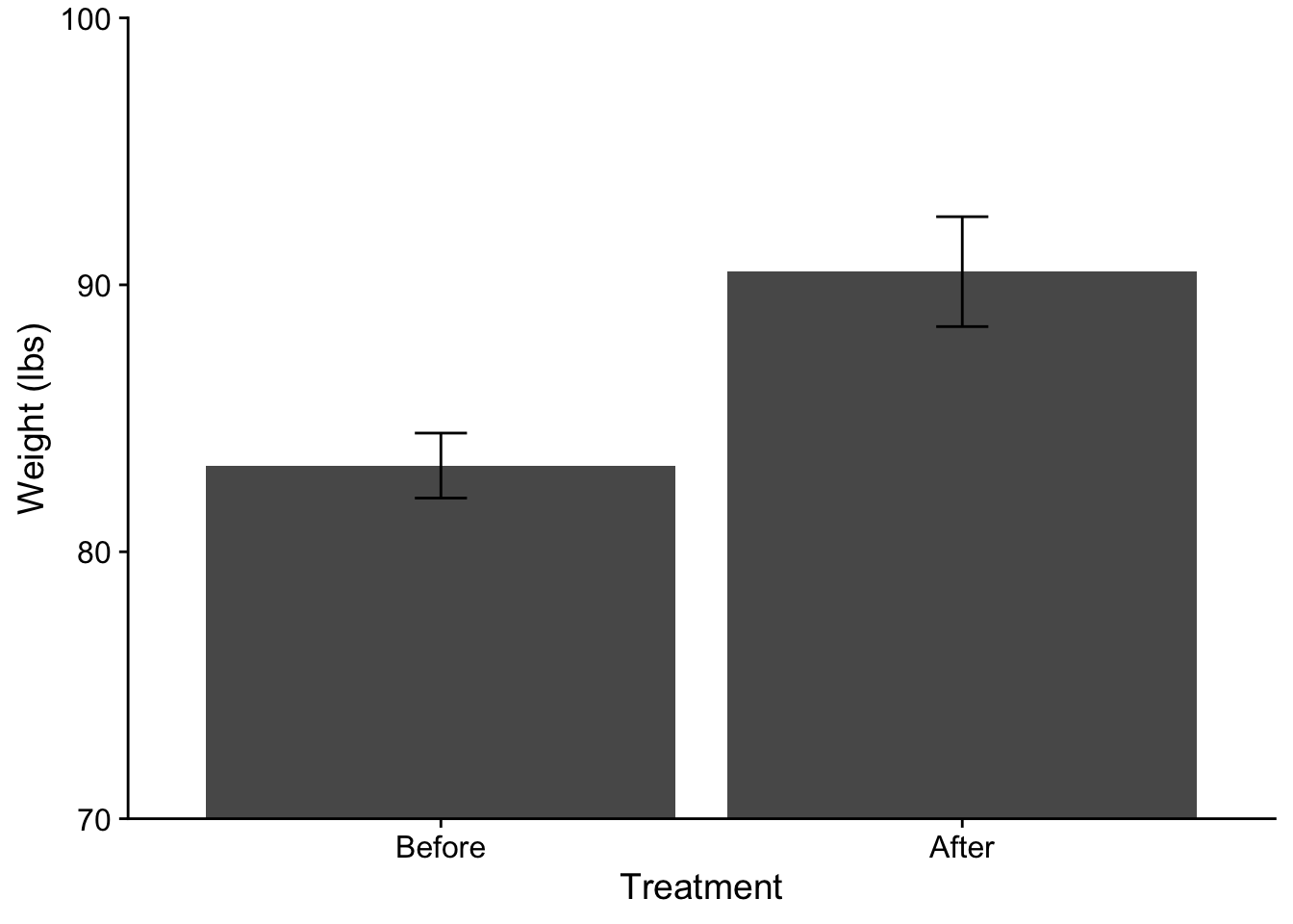 anorexia_data$treatment <-fct_relevel(anorexia_data$treatment, "Before", "After")ggplot(data = anorexia_data, aes(x=treatment, y=weight)) +stat_summary(fun ="mean", geom ="col", fill ="lightgray", color ="black") +# adding some color mods here.stat_summary(fun.data ="mean_se", geom ="errorbar", width = .1) +scale_y_continuous(expand =c(0,0)) +theme_cowplot() +coord_cartesian(ylim =c(70,100)) +xlab("Treatment") +ylab("Weight (lbs)")