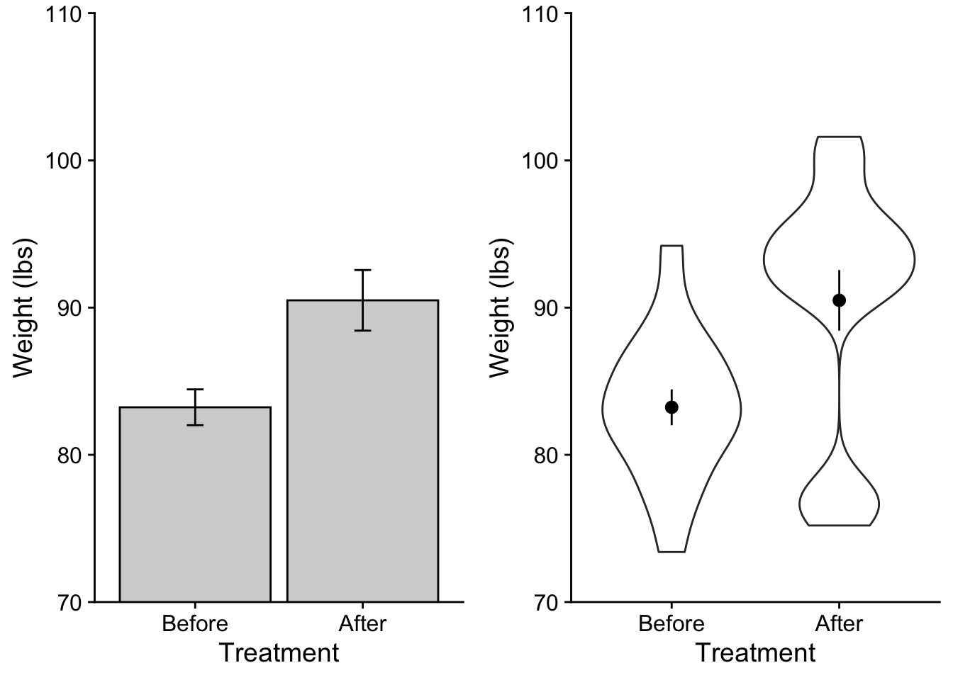 barplot <-ggplot(data = anorexia_data, aes(x=treatment, y=weight)) +stat_summary(fun ="mean", geom ="col", fill ="lightgray", color ="black") +# adding some color mods here.stat_summary(fun.data ="mean_se", geom ="errorbar", width = .1) +scale_y_continuous(expand =c(0,0)) +theme_cowplot() +coord_cartesian(ylim =c(70,110)) +xlab("Treatment") +ylab("Weight (lbs)")# note that order matters. I need to do the violin before the pointrange or else the violin will "paint over" the pointrange.point_violin_plot <-ggplot(data = anorexia_data, aes(x=treatment, y=weight)) +geom_violin() +stat_summary(fun.data ="mean_se", geom ="pointrange", color ="black") +# adding some color mods here.scale_y_continuous(expand =c(0,0)) +theme_cowplot() +coord_cartesian(ylim =c(70,110)) +xlab("Treatment") +ylab("Weight (lbs)")cowplot::plot_grid(barplot, point_violin_plot)