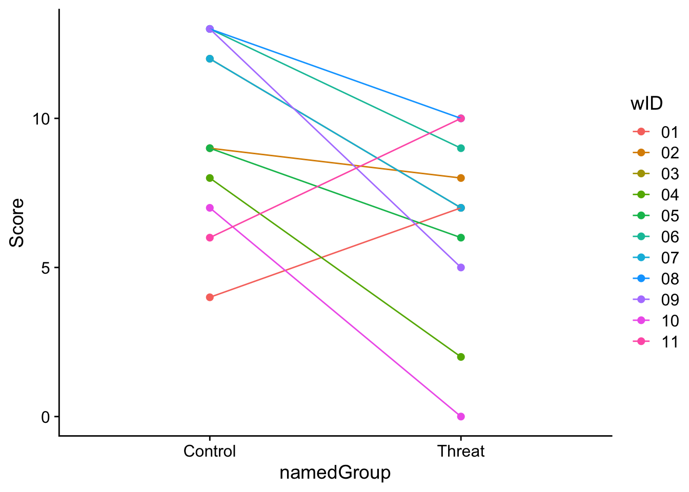 In the case above, we had no we had no basis to believe that a specific data point from one group had a stronger relationship to any particular data point in the other group than to any other data point. That is there was nothing special linking data points between the two groups. Now imagine that instead of two seperate groups, we collected this data from one group of 11 people both in a control condition and under a condition where they were under threat. In this case we might plot the data to include a line connecting the Control and Threat data points for each participant.