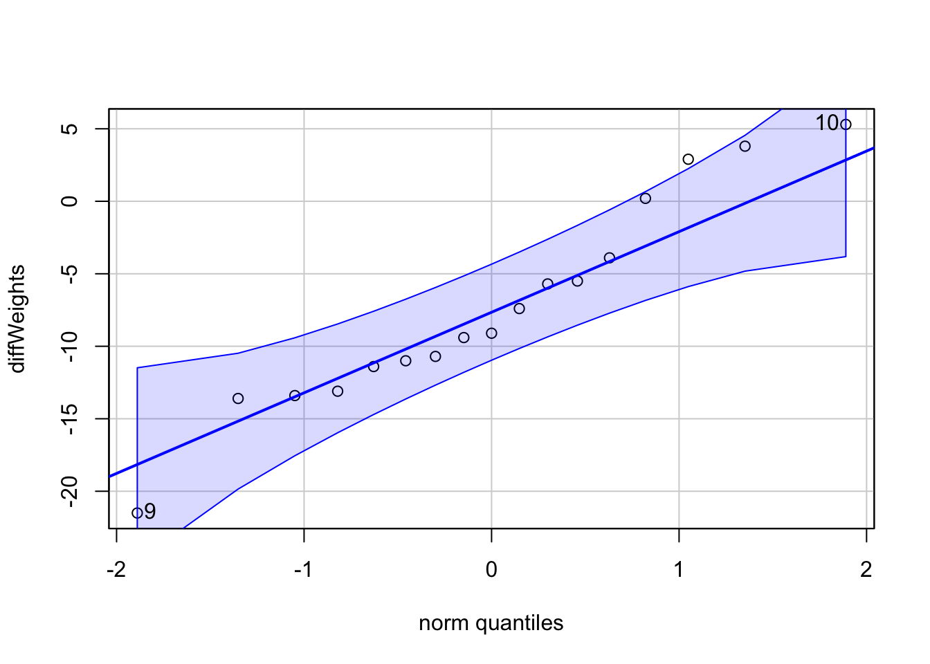 Knowing the design of your experiment also has implications for testing your assumptions. For example, whether you have a paired (matched) sample design (e.g., two samples from the same participants) or an independent sample design (e.g., two seperate groups of people) determines how you go about the business of testing the normality assumption. As we saw in the last walkthrough, if you have an independent samples test, you test each sample separately, noting measures of skew, kurtosis, inspecting the qqPlot, and Shapiro-Wilkes test (though acknowledging that SW is very sensitive). However, if you are running a paired (matched) samples test, you need to be concerned with the distribution of the difference scores. In the present example we are comparing participants’ weights Before treatment to their weight After. This is a paired design, so I need to test the differences between each participant’s Before and After for normality.
