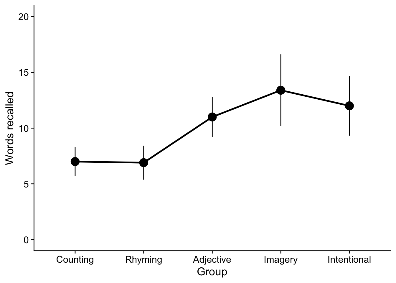 Eysenck randomly assigned 50 subjects between the ages of 55 and 65 years to one of five groups—four incidental-learning groups and one intentional-learning group. (Incidental learning is learning in the absence of the expectation that the material will later need to be recalled.) The Counting group was asked to read through a list of words and simply count the number of letters in each word. This involved the lowest level of processing, because subjects did not need to deal with each word as anything more than a collection of letters. The Rhyming group was asked to read each word and think of a word that rhymed with it. This task involved considering the sound of each word, but not its meaning. The Adjective group had to process the words to the extent of giving an adjective that could reasonably be used to modify each word on the list. The Imagery group was instructed to try to form vivid images of each word. This was assumed to require the deepest level of processing of the four incidental conditions. None of these four groups were told that they would later be asked for recall of the items. Finally, the Intentional group was told to read through the list and to memorize the words for later recall. After subjects had gone through the list of 27 items three times, they were given a sheet of paper and asked to write down all of the words they could remember. If learning involves nothing more than being exposed to the material (the way most of us read a newspaper or, heaven forbid, a class assignment), then the five groups should have shown equal recall—after all, they all saw all of the words. If the level of processing of the material is important, then there should have been noticeable differences among the group means.