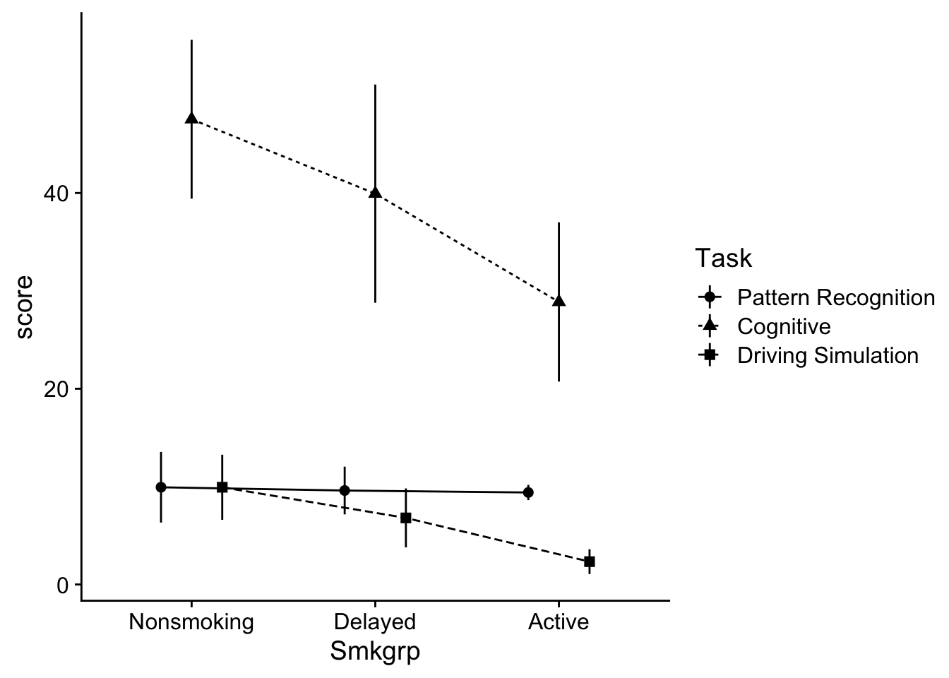 ggplot(data = dataset, mapping=aes(x=Smkgrp,y=score,group=Task, shape = Task)) +